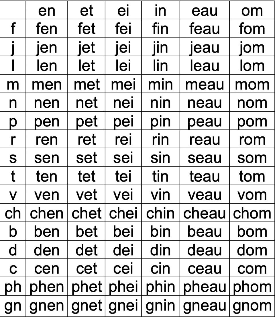 Tableau de syllabes avec des sons complexes en noir :