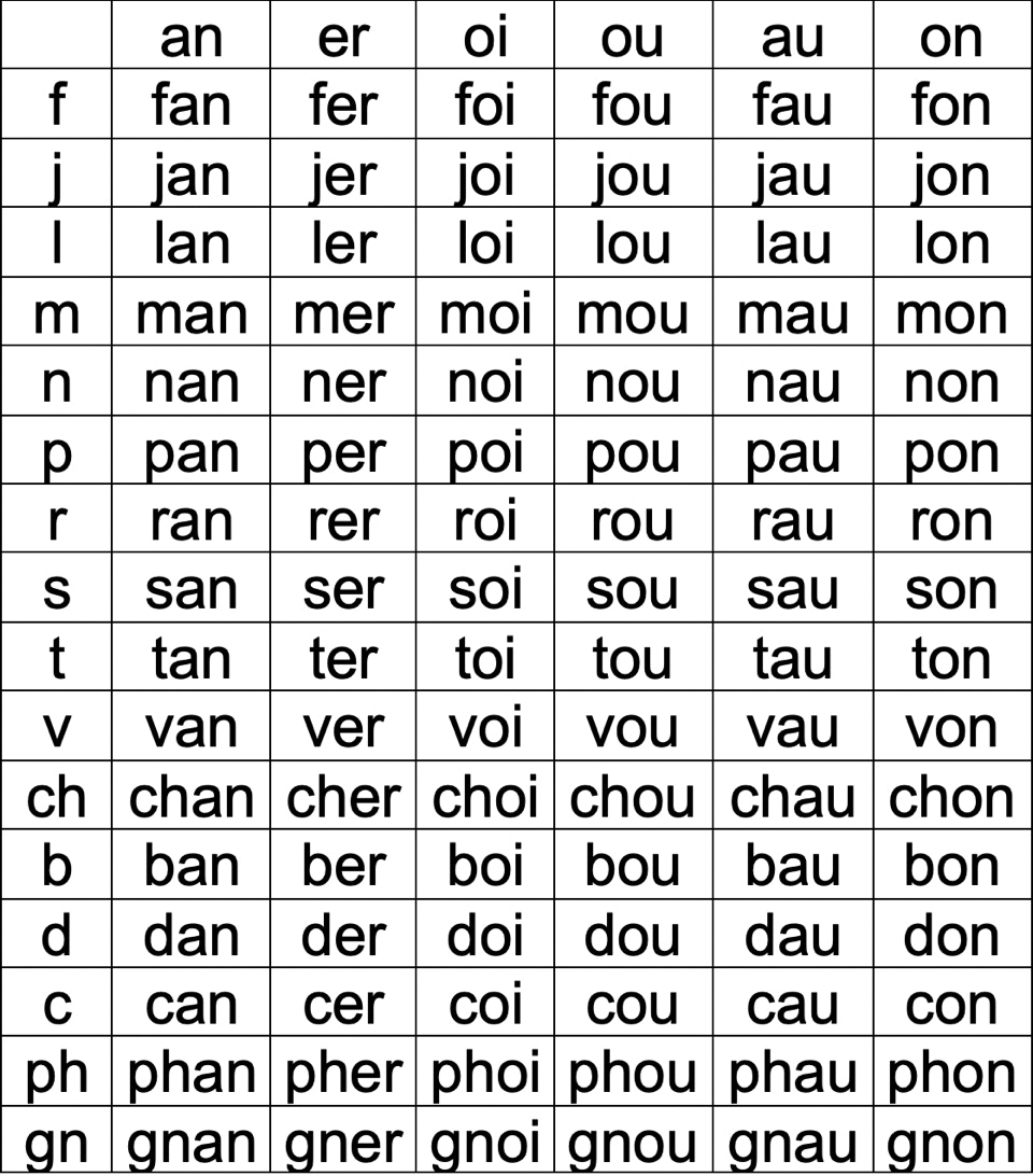 Tableau de syllabes avec des sons complexes en noir :