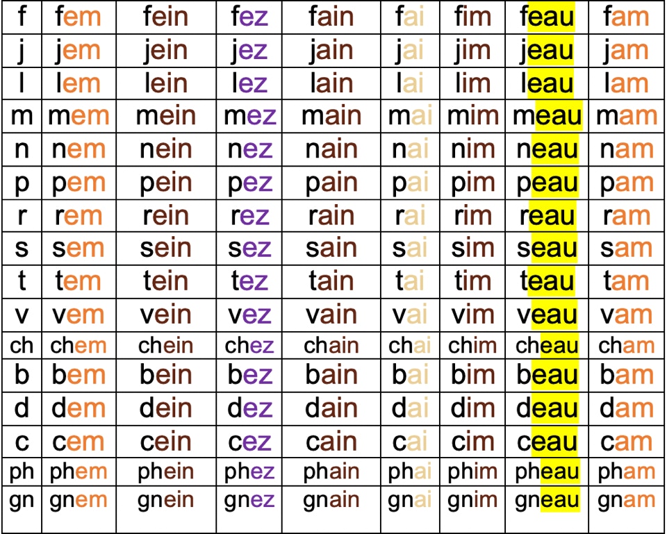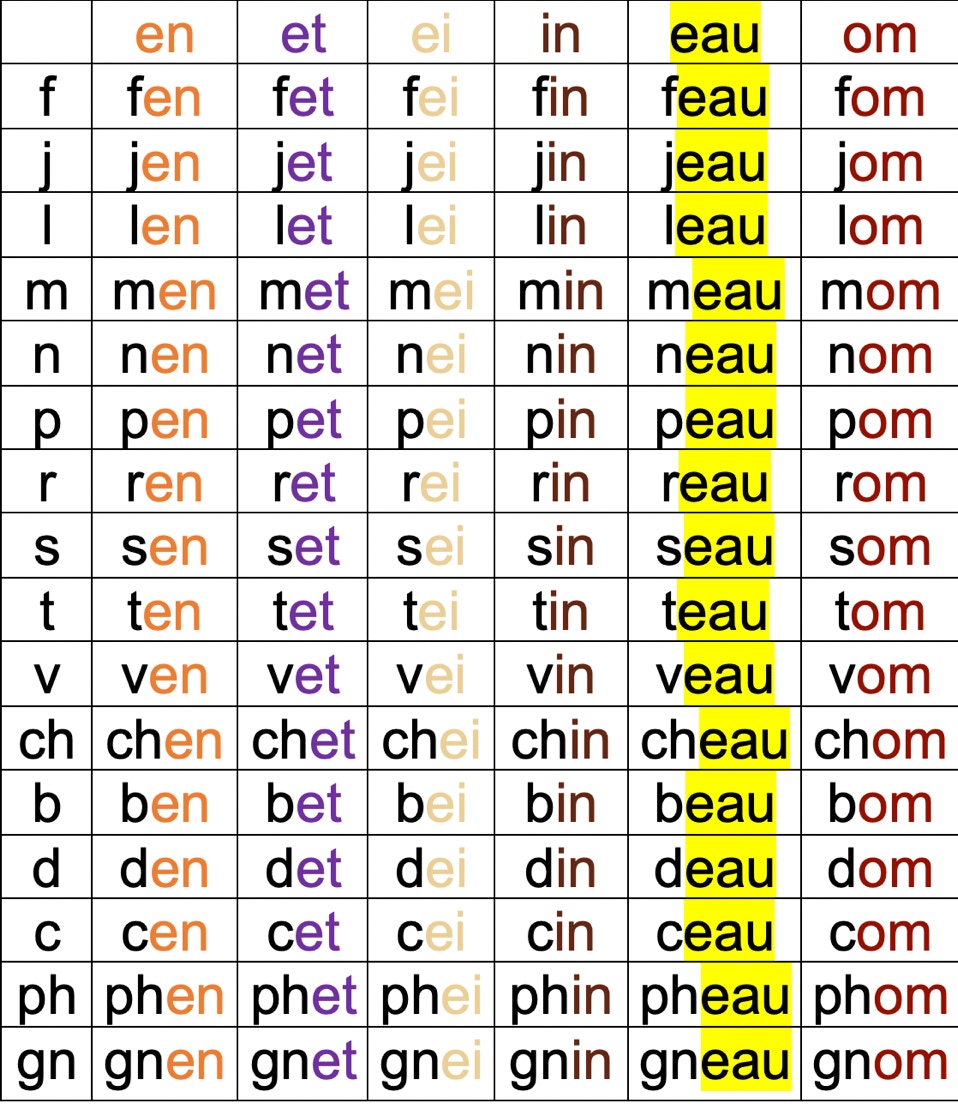 Tableau de syllabes avec des sons complexes en couleur :
